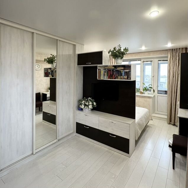 Окна квартиры выходят на 2 стороны. Жилую комнату можно отгородить от общей зоны для максимальной приватности, или сделать просторную гостиную.
