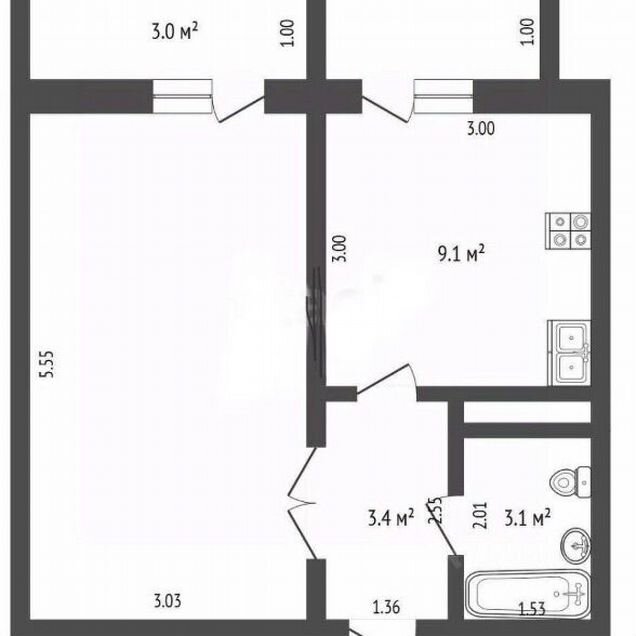 Площадь квартиры без учета балкона: 30,7 кв.метров. Высота потолков 2,89 м, что визуально увеличивает площадь.