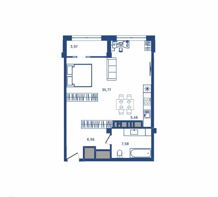 раздельные зоны кухни, гостиная и спальни, комфортный совмещённый санузел с тёплым полом, оборудованная лоджия и компактный коридор.