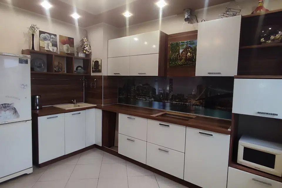 Большая кухня-столовая с современным гарнитуром и бытовой техникой.