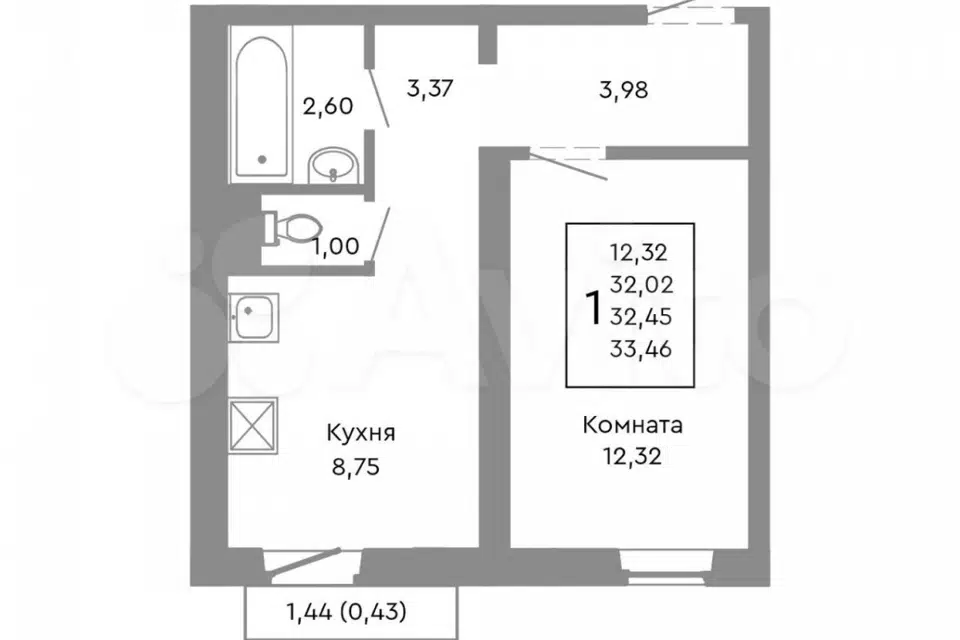1-комн. кв., 33.2 м², 1/10 этаж