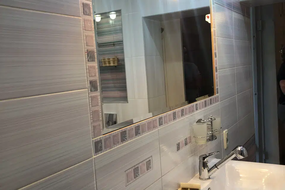 Санузел в кафеле, поменяна вся сантехника, трубы, установлен водонагреватель