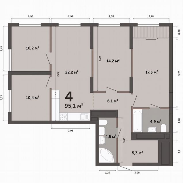 Идеальный вариант для тех, кто любит домашнее спокойствие. Ведь в квартире 3 раздельные спальни, большая кухня, гостиная и рабочие кабинеты!