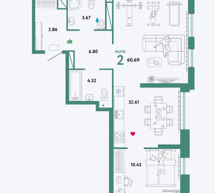 2-комн. кв., 60.69 м², 32/32 этаж