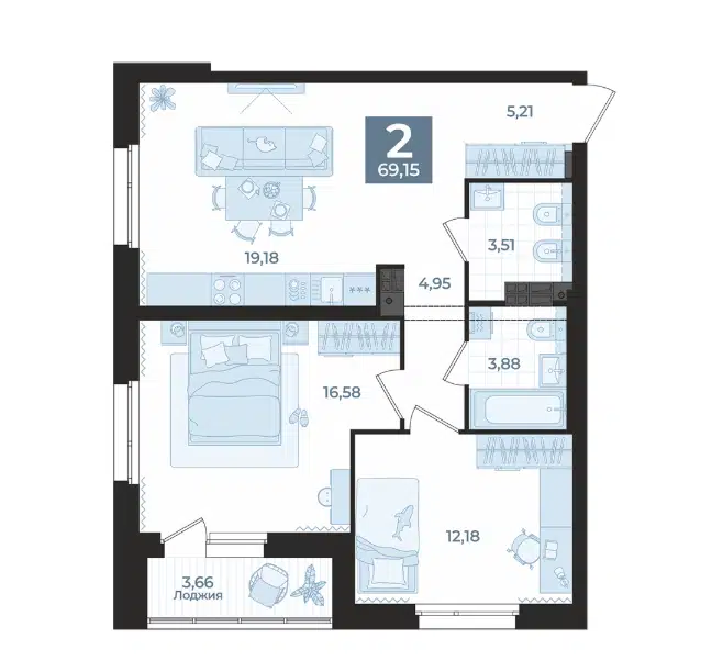 2-комн. кв., 69.15 м², 4/16 этаж