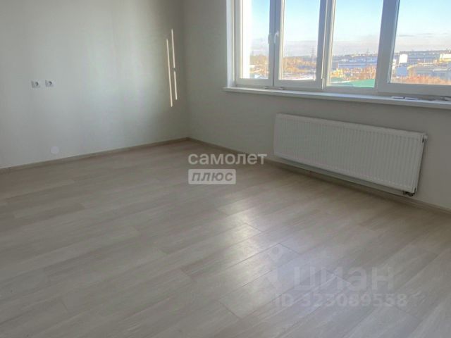 В комнате установлены большие окна с белыми рамами, которые обеспечивают хорошее естественное освещение. Квартира в чистовой отделке и готова к обустройству. Отсутствие мебели и декора позволяет представить различные варианты дизайна и использования пространства.