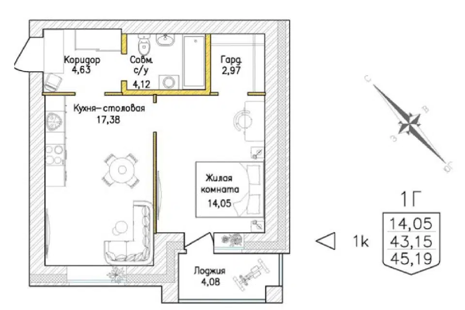 1-комн. кв., 38.1 м², 3/15 этаж