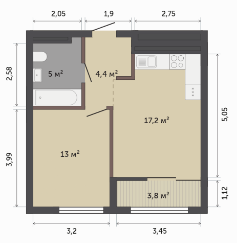 2-комн. кв., 41.5 м², 8/9 этаж