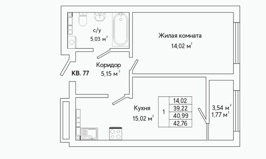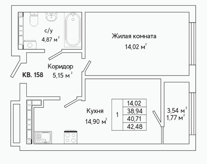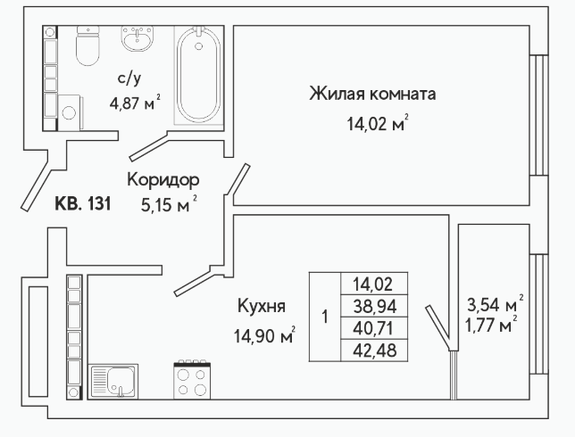1-комн. кв., 41.9 м², 14/25 этаж