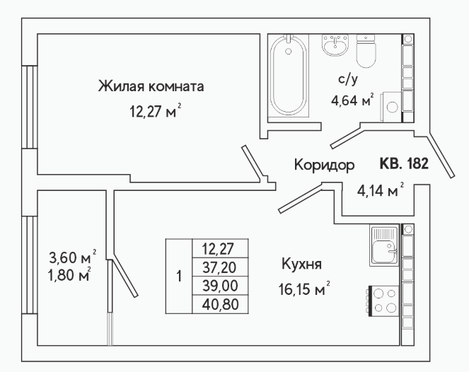 1-комн. кв., 39.6 м², 3/16 этаж