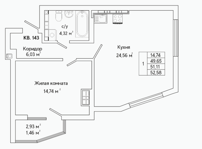 1-комн. кв., 51.1 м², 16/25 этаж