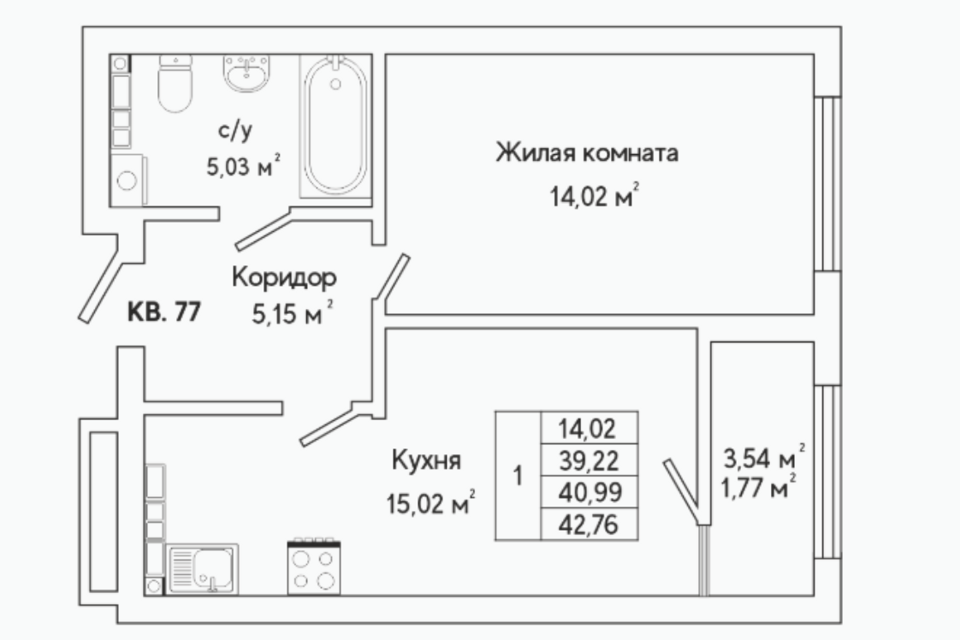 1-комн. кв., 42.3 м², 8/25 этаж