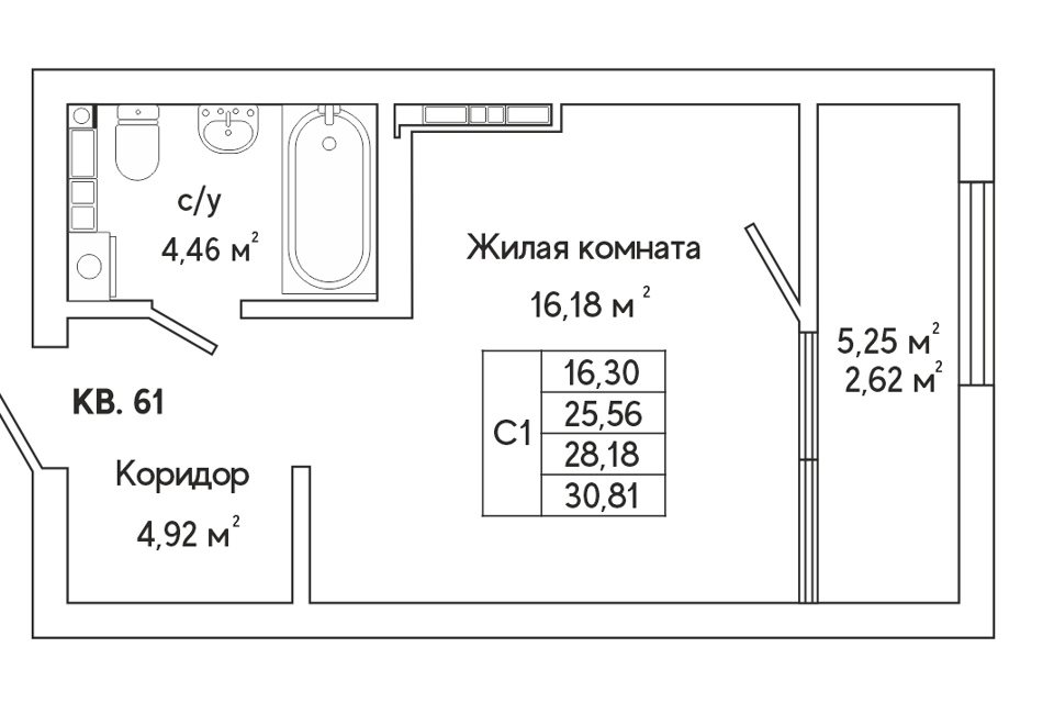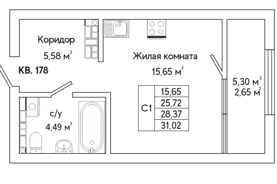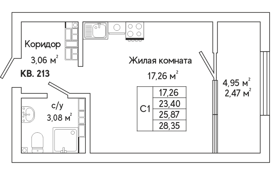 Студия, 28.6 м², 15/25 этаж