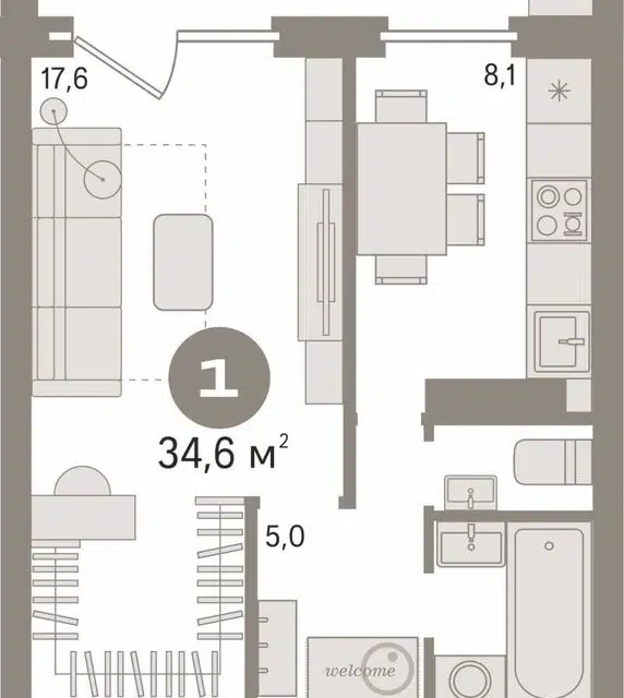 1-комн. кв., 34.6 м², 8/12 этаж