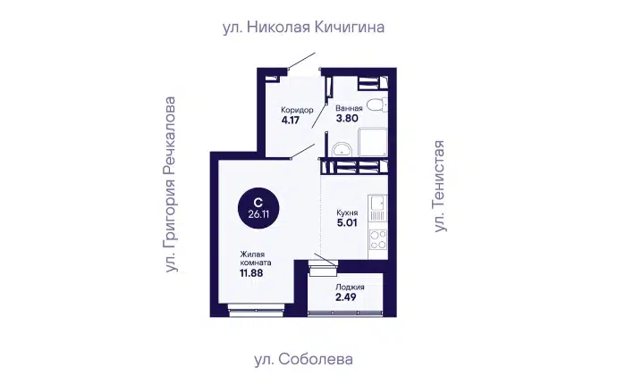 Студия, 26.11 м², 24/25 этаж