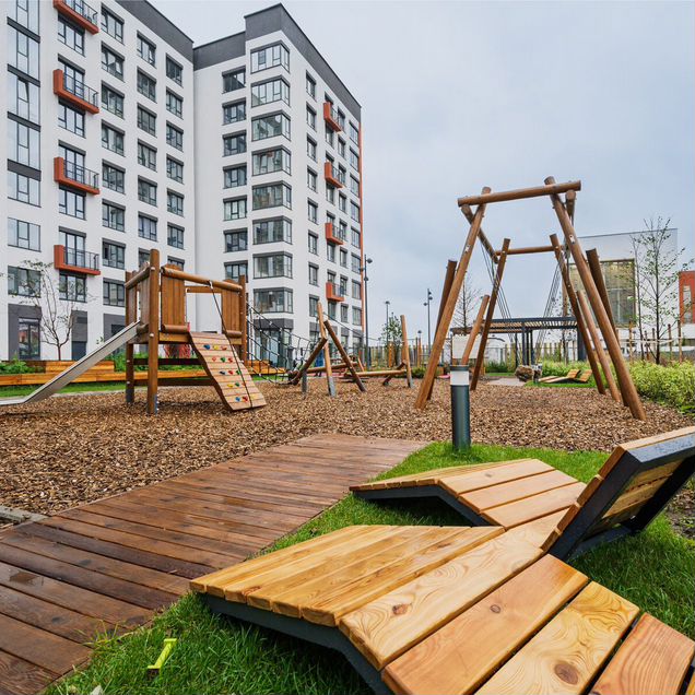 - Благоустроенная детская площадка с использованием малых архитектурных форм