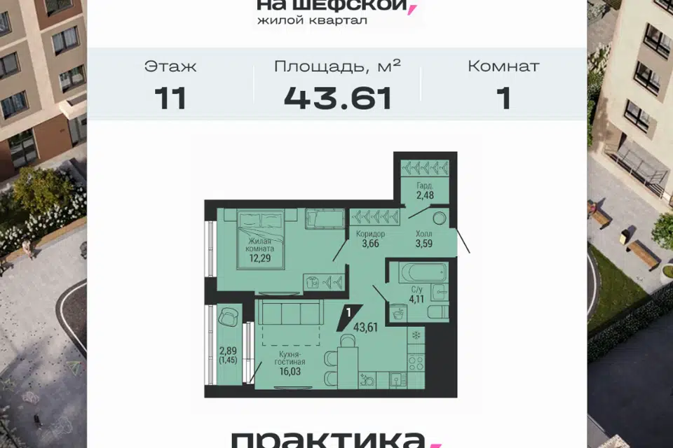 1-комн. кв., 40.8 м², 10/16 этаж