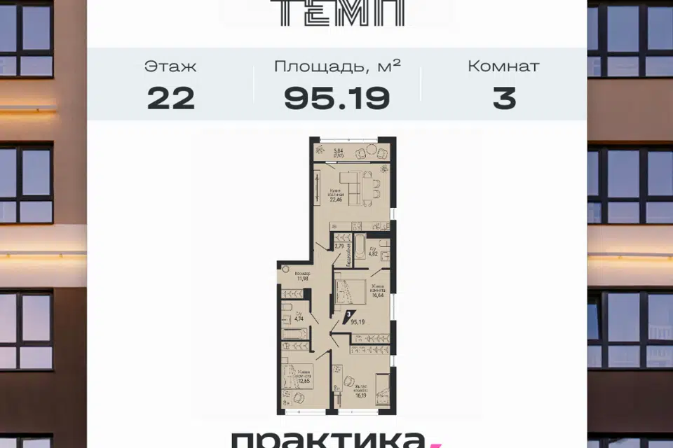 2-комн. кв., 64.6 м², 16/22 этаж