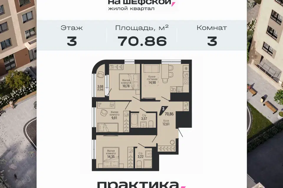 3-комн. кв., 70 м², 17/18 этаж