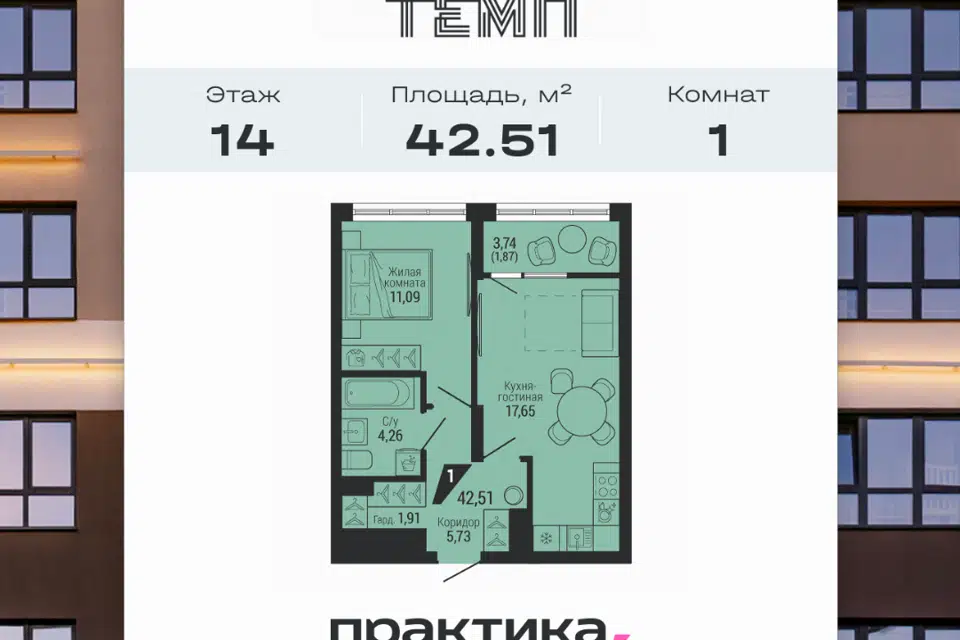 1-комн. кв., 42.9 м², 17/25 этаж