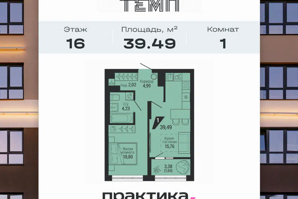 1-комн. кв., 42.62 м², 7/22 этаж