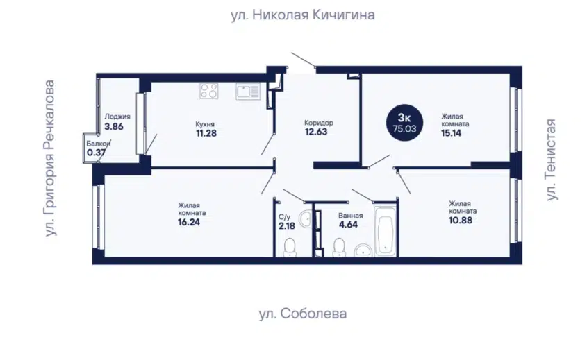 3-комн. кв., 75.03 м², 4/25 этаж