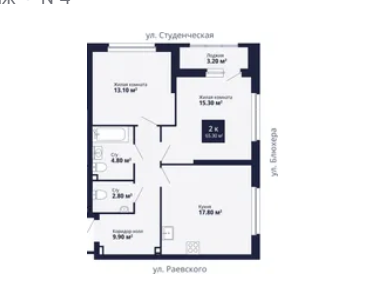Площадь: 55 м² | Жилая: 25 м² | Кухня-гостиная: 17 м²