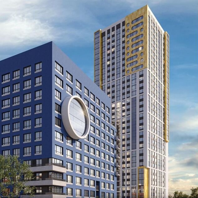 Класс дома: комфорт. Отделка: чистовая. Архитектурное решение: строгий фасад дома выполнен в глубоком синем цвете и дополнен выразительным элементом, напоминающим огромную линзу. Объем здания также формируют навесные балконы. Вид из окон: на центр города.