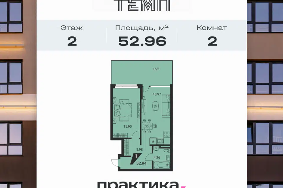 2-комн. кв., 52.96 м², 2/22 этаж