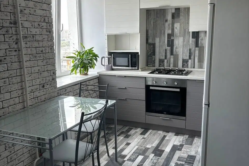 - Кухонный гарнитур в цветовой гамме квартиры (серые оттенки, светлое дерево).