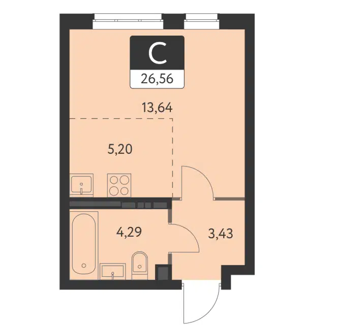 Студия, 26.6 м², 15/17 этаж