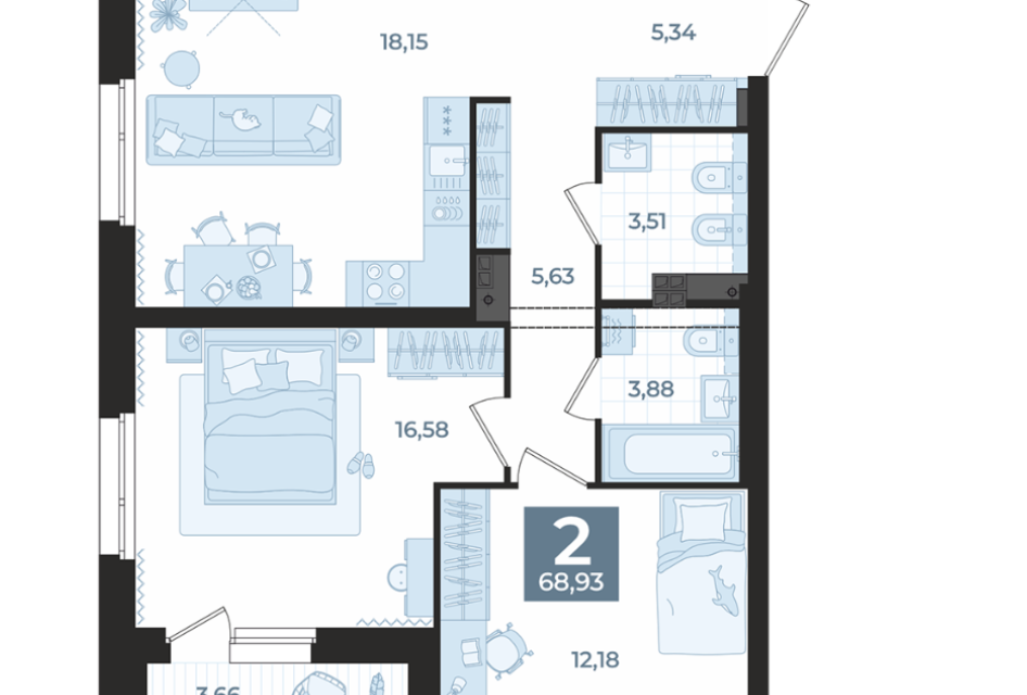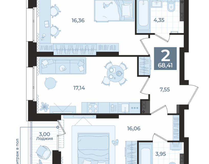 2-комн. кв., 68.93 м², 3/16 этаж