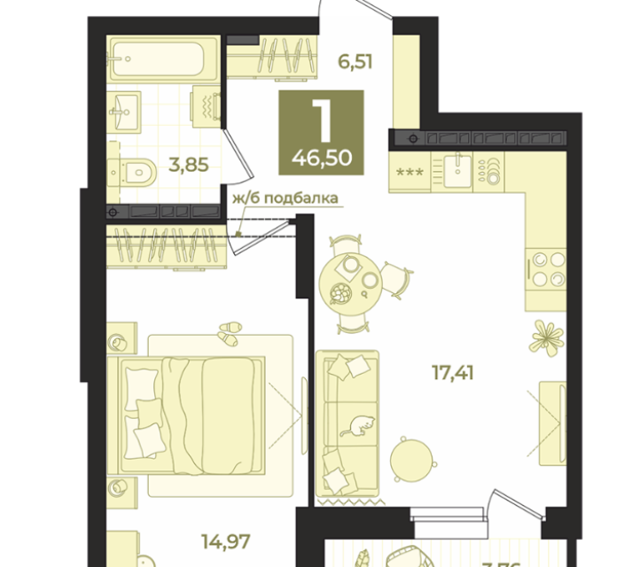 1-комн. кв., 46.5 м², 14/16 этаж