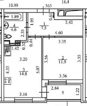 Площадь жилой комнаты 18,4 кв.м., площадь кухни 8,5 кв.м.