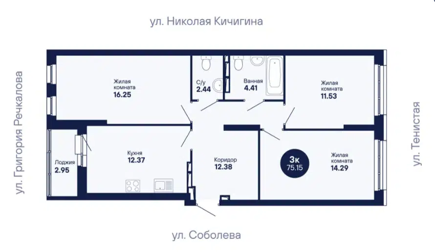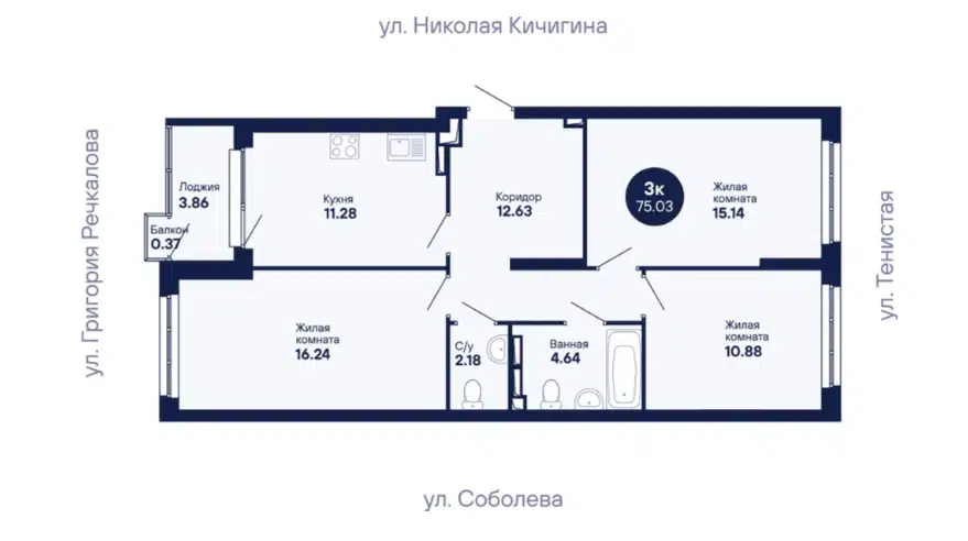 3-комн. кв., 75.15 м², 8/24 этаж