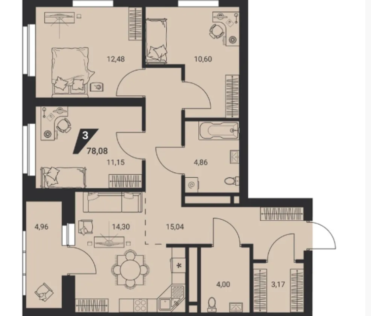 3-комн. кв., 78.08 м², 24/25 этаж