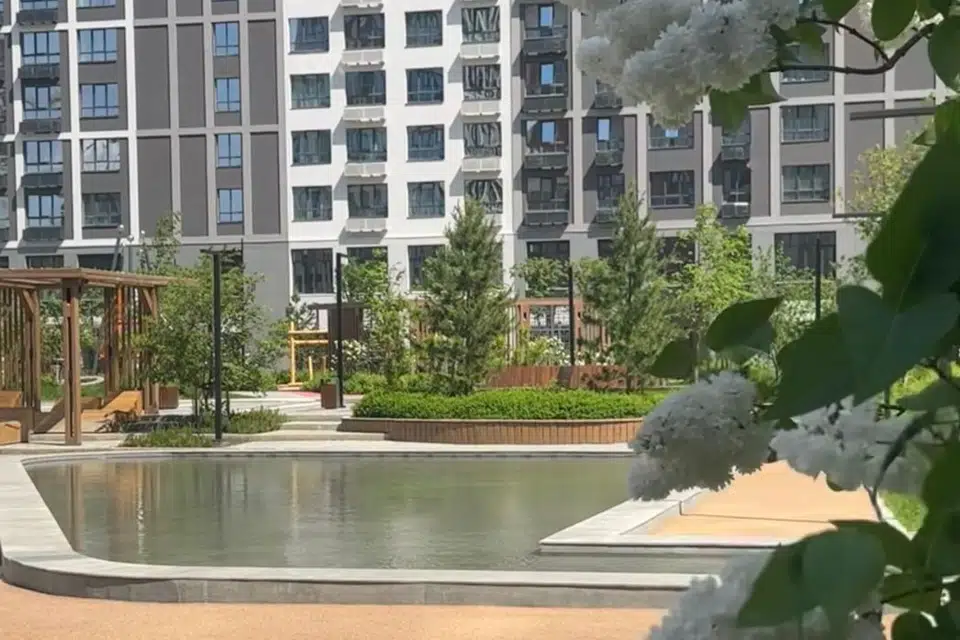 -здесь просто шикарный двор размером 2 Га (см фото), он поделен на спортивные площадки, игровые зоны, искусственные водоемы и реки, море зелени. Дети и жены точно будут в восторге.