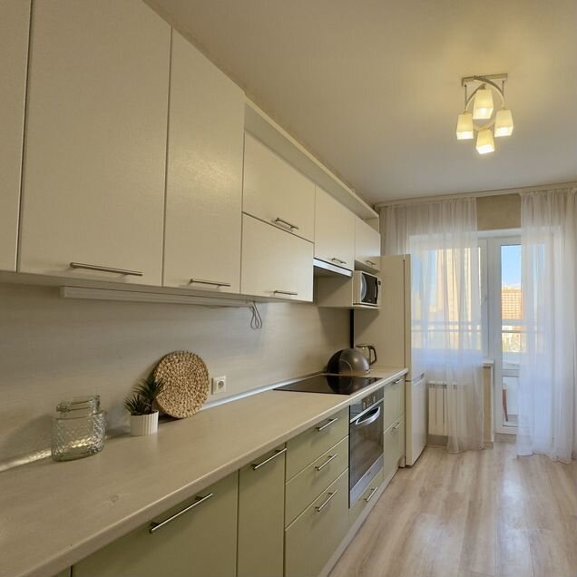 Квартира полностью мебелирована. Имеются холодильник, индукционная варочная панель, стиральная машина, микроволновка, водонагреватель, просторная застеклённая лоджия.