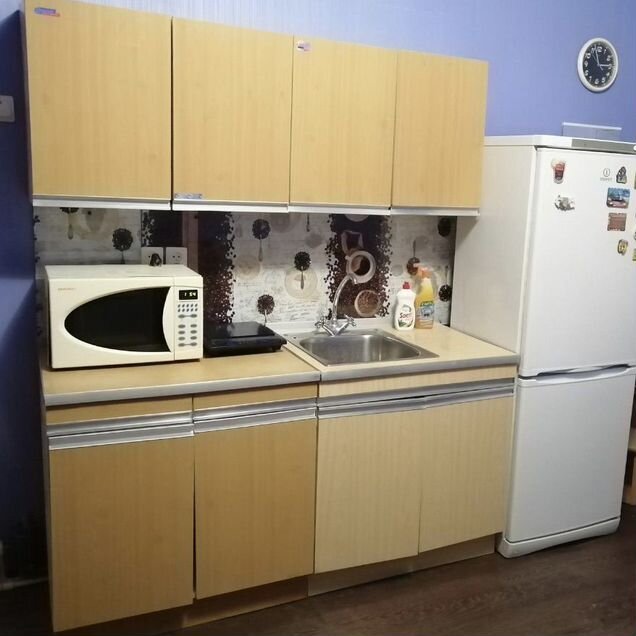 * Кухня: плита, микроволновка, холодильник, чайник, посуда.