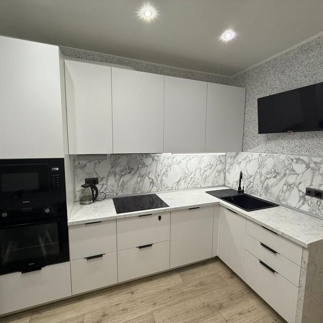 Кухня укомплектована новой встроенной бытовой техникой: варочная панель, вытяжка, духовой шкаф, посудомоечная машина, встроенный