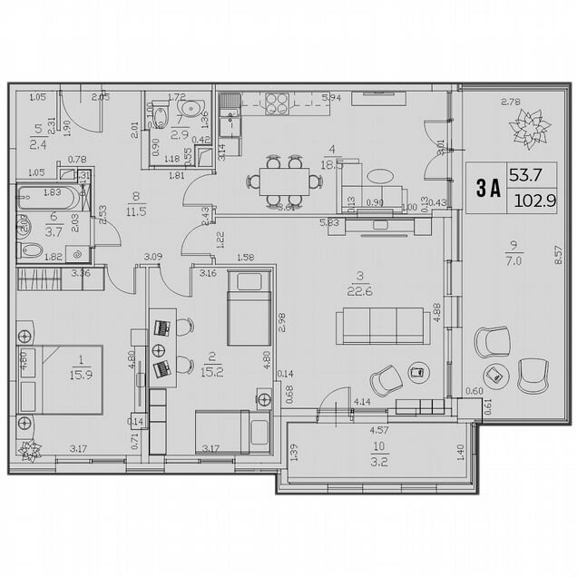 Продуманная планировка: 3 изолированные спальни + кухня-гостиная, 2 санузла, прачечная, гардеробная и просторная прихожая.