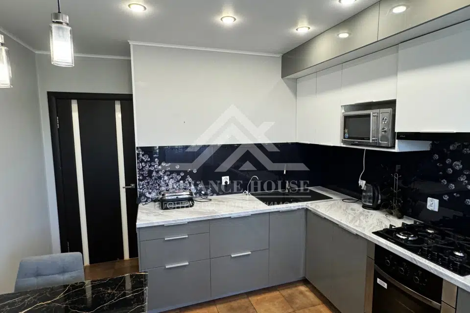 В квартире выполнен современный, качественный ремонт, окна пластиковые, сан узел в плитке (установлены теплые полы), натяжные потолки со встроенными светильниками и стильными бра над обеденной зоной. Установлен кухонный гарнитур со встроенной техникой Ханса (холодильник, духовая печь, варочная поверхность).