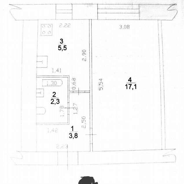 Общая площадь: 17,4 м² - изолированная комната, зона кухни и большой совмещенный санузел в кафеле.