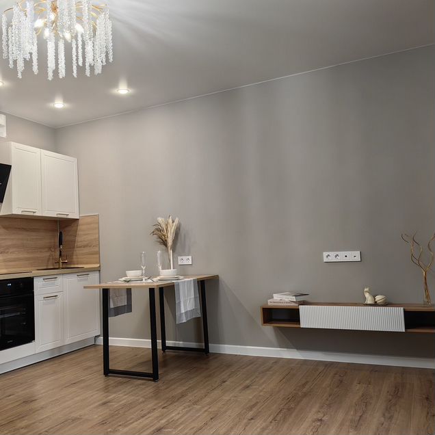 - функциональная кухня со всей необходимой встроенной техникой (духовой шкаф, варочная поверхность, вытяжка с подсветкой, качественные раковина и смеситель с подключением фильтра питьевой воды, столовая зона;