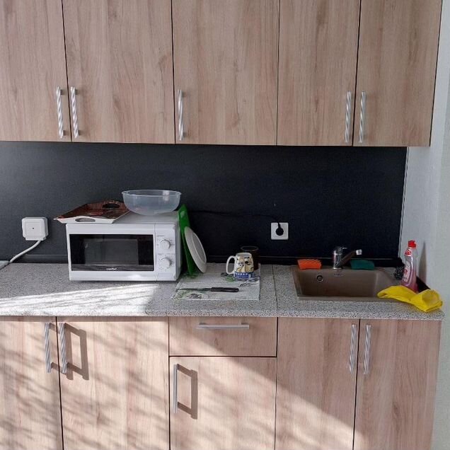 Есть свой санузел с душем, стиральной машиной. Своя кухня с плитой и микроволновкой.