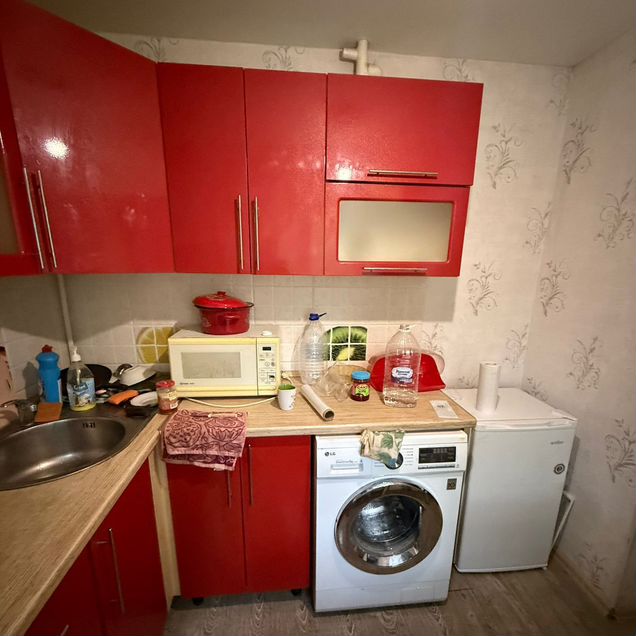 Имеется всё необходимое по мебели и техники: кровать, шкафы, микроволновка, холодильник, стиральная машина, тв, электрочайник.