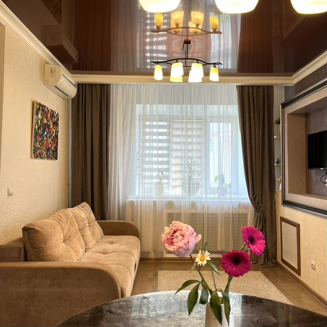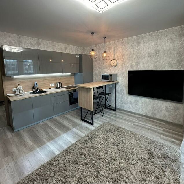 Интерьер квартиры выполнен в стильном современном дизайне, украшен качественными материалами и продуман до мельчайших деталей. Здесь вас ожидает просторная студия с грамотно зонированным пространством, позволяющим комфортно разместиться как одному человеку, так и паре друзей или молодоженов.