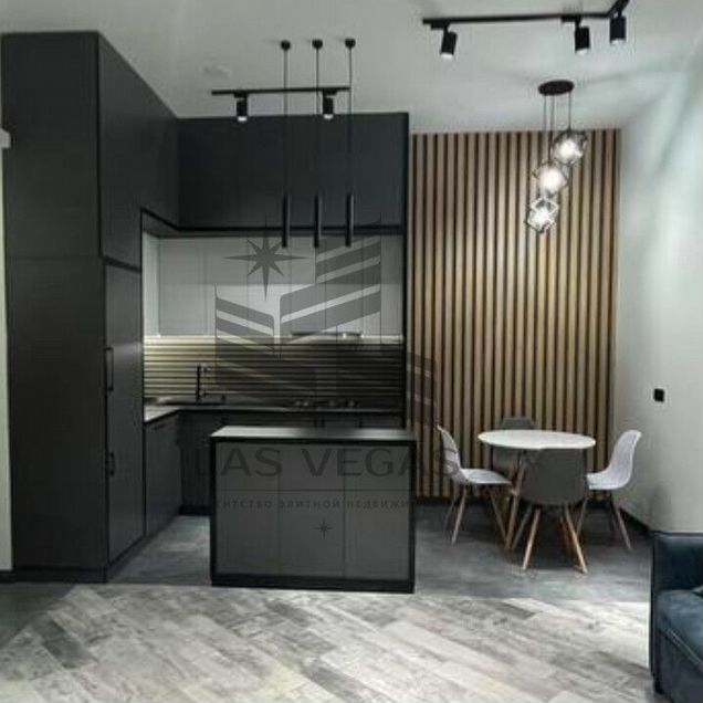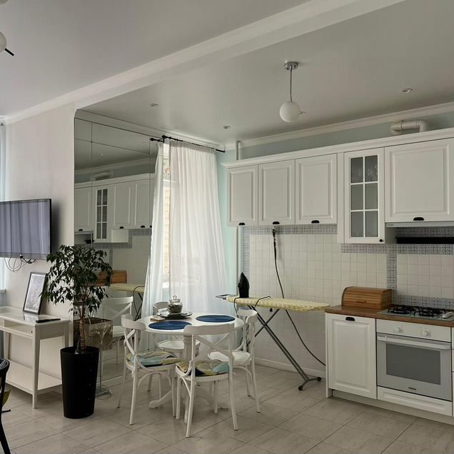Студия с гардеробной и кладовой для бойлера и стиральной машиной. Потолки сделали месяц назад. В оснащении полноценная кухня, (духовка, индукционная плита, посудомойка, вытяжка. Сан узел с ванной и инсталяцией. Полноценный спальный гарнитур.