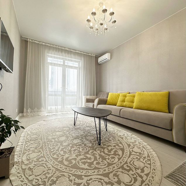 В квартире свежий дизайнерский ремонт в светлых тонах и есть всё для проживания. Полностью оборудованная кухня с большой рабочей поверхностью, ящики с доводчиками, холодильник, варочная поверхность, стиральная машина, микроволновка. Просторная жилая комната с мягкой мебелью и телевизором. Большая широкая лоджия с выходом из кухни и комнаты, здесь можно сделать кабинет и зону хранения. Ремонт новый, состояние отличное. Квартира без обременений, один взрослый собственник, документы готовы к сделке. Звоните, показ в любой день.