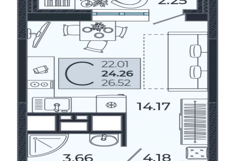 Студия, 24.26 м², 20/22 этаж